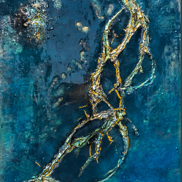 As a French–Khmer artist, she carries within her two rich cultural lineages that shape the heart of her practice. Raised in an artistic household—a French mother trained at the Beaux-Arts in Paris and a Cambodian father who was both poet and lecturer in Phnom-Penh—she grew up surrounded by words, images, and traditions that marked her early imagination. After a brief academic period in Switzerland, she continued refining her craft alongside gifted teachers, expanding her visual language across a wide range of mixed media: minerals, cellulose, sand, metal, resin, and plant fibers. Through these materials, she constructs an evocative universe where memory, heritage, and healing intertwine.